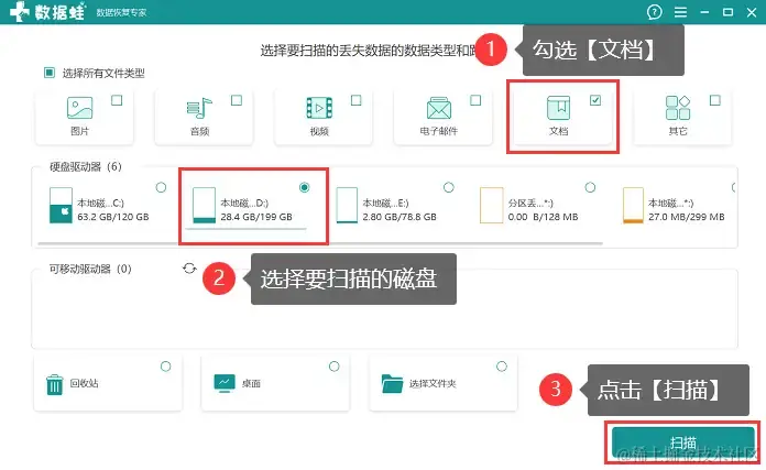 步骤2:需要恢复PPT的用户可以只勾选【文档】,然后对需要扫描的磁盘进行选择,再点击 【扫描】;