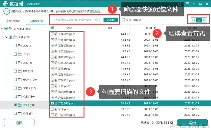步骤3:软件扫描完成后,会呈现扫描到的所有PPT文档数据,用户可以直接在【筛选器】 中输入文件的名称进行查找,并将其勾选;