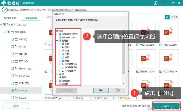 步骤4:确认所需恢复的文件选择正确后,单击【导出】,并选择一个合理的保存位置来保存文档,等待导出完成即可。