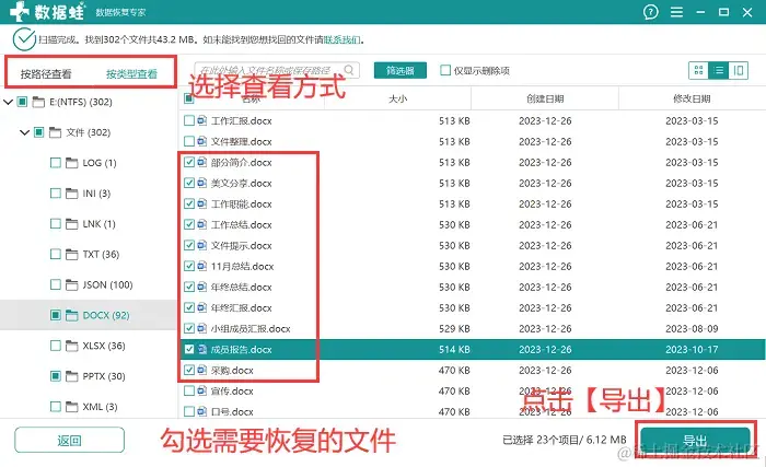 第2步:在扫描过程完成后,根据不同的文件类型或路径定位到需要恢复的文件,将它勾选上,点击【导出】,并选择与原保存位置相区别的磁盘保存文件。