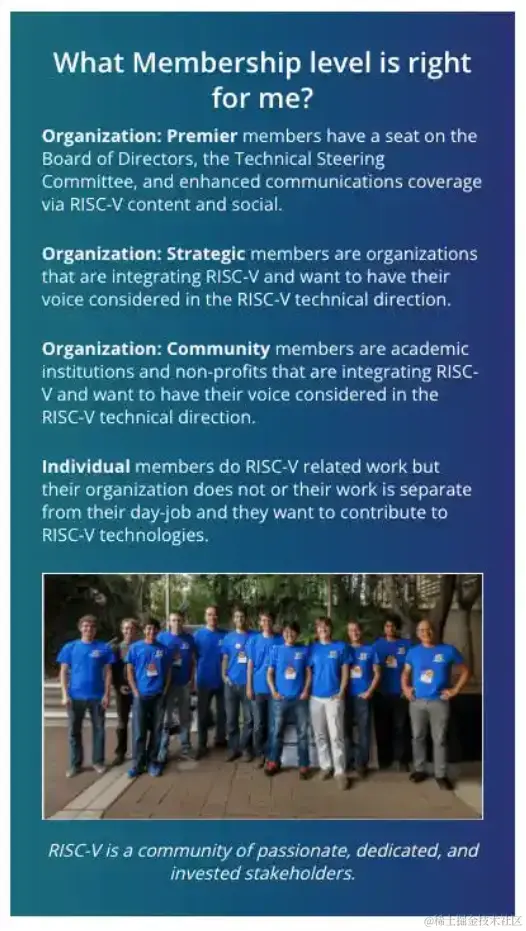 RISC-V 主要面向企业、学术界、非营利组织或个人,根据员工数量及法人实体类型,各个组织均有不同的福利与会费额度。