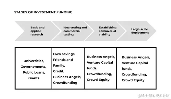 在下图中,我们可以看到从理论研究到大规模部署的各个融资阶段。