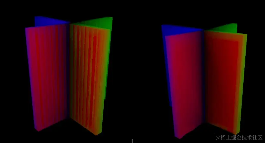 测试下效果,用2个非垂直(垂直问题小很多)交叉隔开的4个空间,分别打3个不同颜色的灯,不打灯的空间为黑色换角色,然后每0.5米一个探针,均匀放置探针,并创建出3DTexture。可以看到Normal偏移在非交叉处是对的,偏移方向就刚好是法线方向。