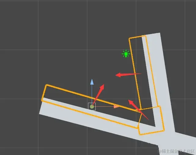 这个图里,黑色的Mesh与绿色Mesh相交,那么露出的顶点显示的红色Bent Normal方向是对的,但是最右边的顶点因为在物体内部,所以它没有计算出Bent Normal,这样渲染的黄色部分的Bent Normal是左右2个顶点插值的结果,就导致黄色的Bent Normal偏移角度不够,依然会插值到绿色框内部或右面的探针而产生漏光。