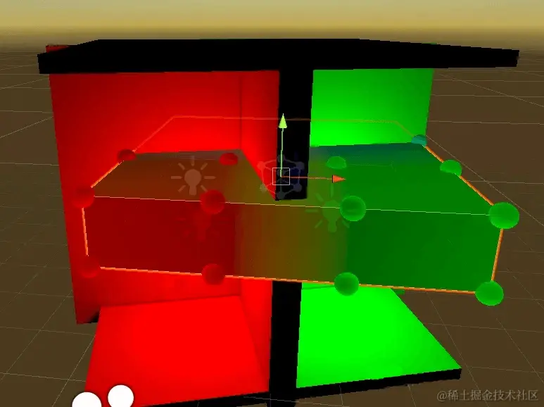 下图所示,绿色圈表示当前ShadingPoint位置;2个红圈表示用来插值的2个Probe颜色。为了直观只演示x方向上的判断。
