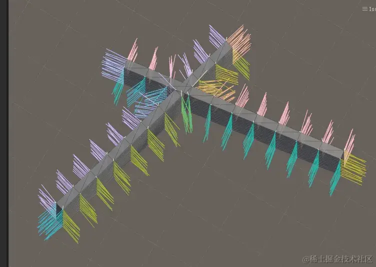 从顶视图看,我们为其中一个空间摆放3个偏移Cube,预计算每个Cube中心的非遮挡范围的中心方向(可见度Cone的轴线方向)为箭头所示,并把这个方向当作颜色为3个Cube渲染到单独RendererTexture。