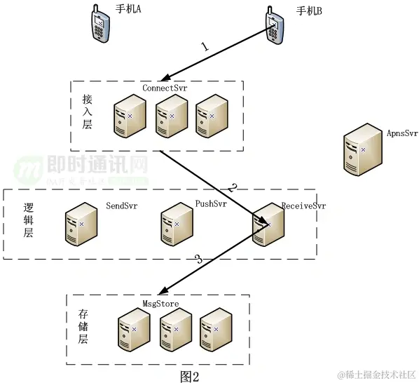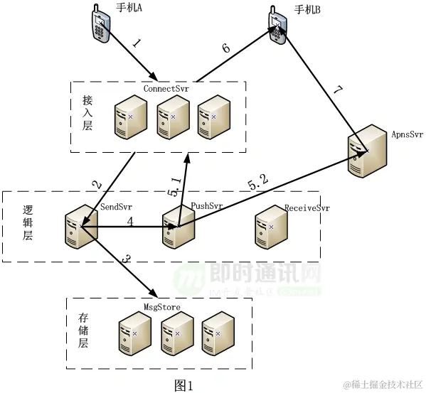 1) 4 - 逻辑层 SendSvr 将给手机 B 的新消息到达通知发送到通知处理服务器 PushSvr。