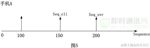 **如上图5所示:**手机 A 在下一次再次上来服务器收取消息,此时 Seq_cli = 150,服务器的 Seq_svr = 200,那手机 A 可以将 sequence为[151 - 200]的消息收取下去。