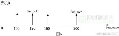**如上图6所示:**假如原手机 A 用户换到手机 B 登录,并使用 Seq_cli = 120 上服务器收取消息,由于服务器已经确认 sequence <= 150 的消息已经被手机收取下去了,故不会再返回 sequence 为[121 - 150]的消息给手机 B,而是将 sequence 为[151 - 200]的消息下发给手机 B。