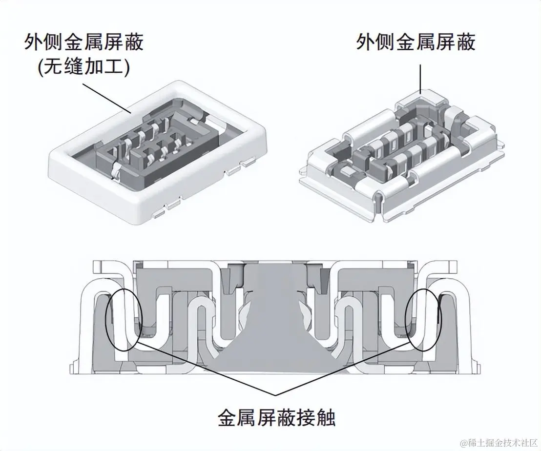 全方位接触的无缝金属屏蔽,兼具优异的EMI特性和高牢固性