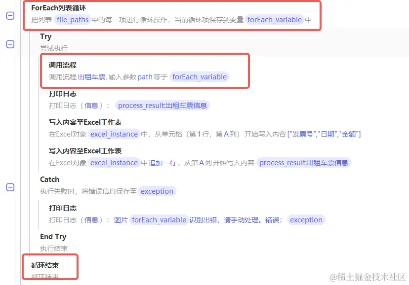 5. 使用【ForEach列表循环】指令,循环上面获取到的票据路径列表,并调用子流程识别数据