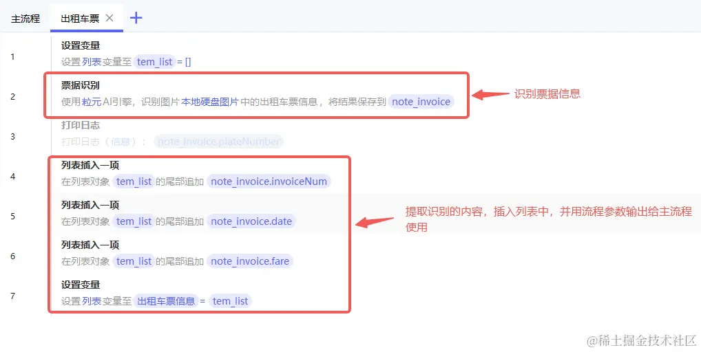 4. 根据提供的流程参数,判断执行“出租车车票”子流程和“火车票”子流程