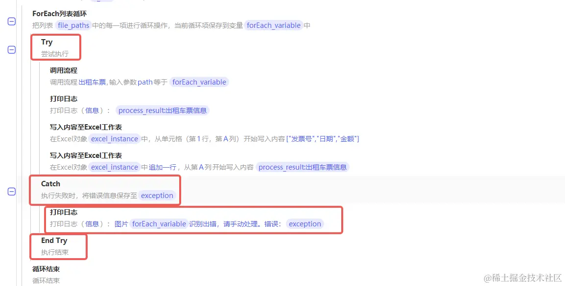 8. 单个循环过程中可能会出现种种异常,比如识别出错,或者Excel写入出错等,会导致循环进行不下去出错,这里加了Try catch指令来兼容,单个循环出错不影响继续执行流程