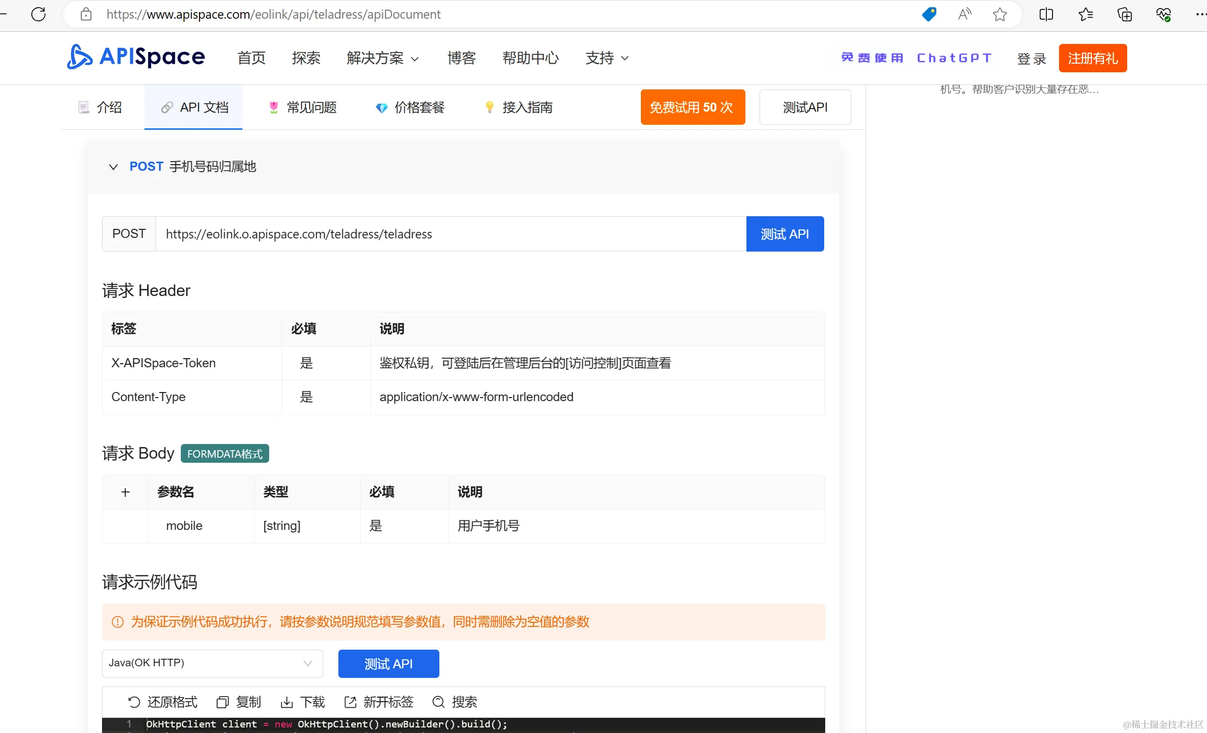 大多数手机号码归属地API服务都需要用户注册并获取一个API密钥。这个密钥将在每次请求API时使用,以验证用户身份并计费(如果API收费的话)。例如 APISpace 的 手机号码归属地API。