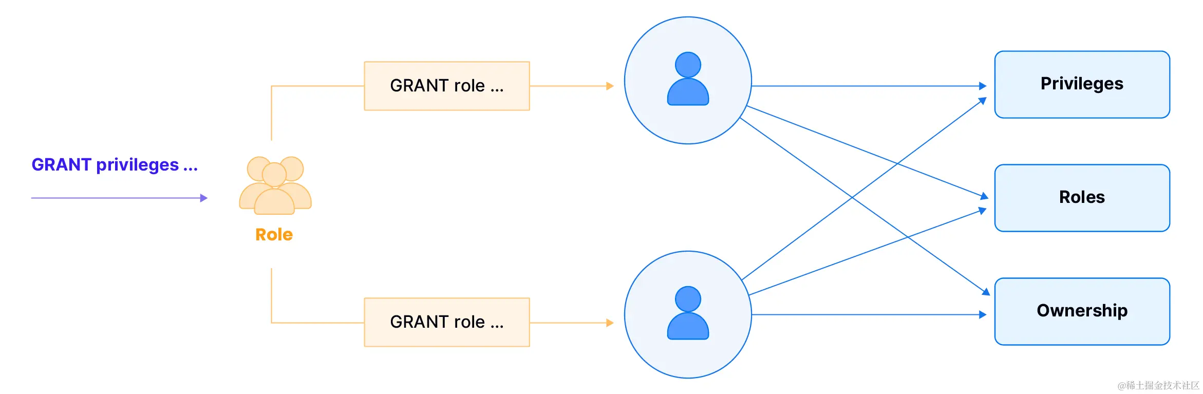 - 所有权只能授予角色;不允许将所有权授予用户。一旦从一个角色转移给另一个角色,所有权就转移到新角色。