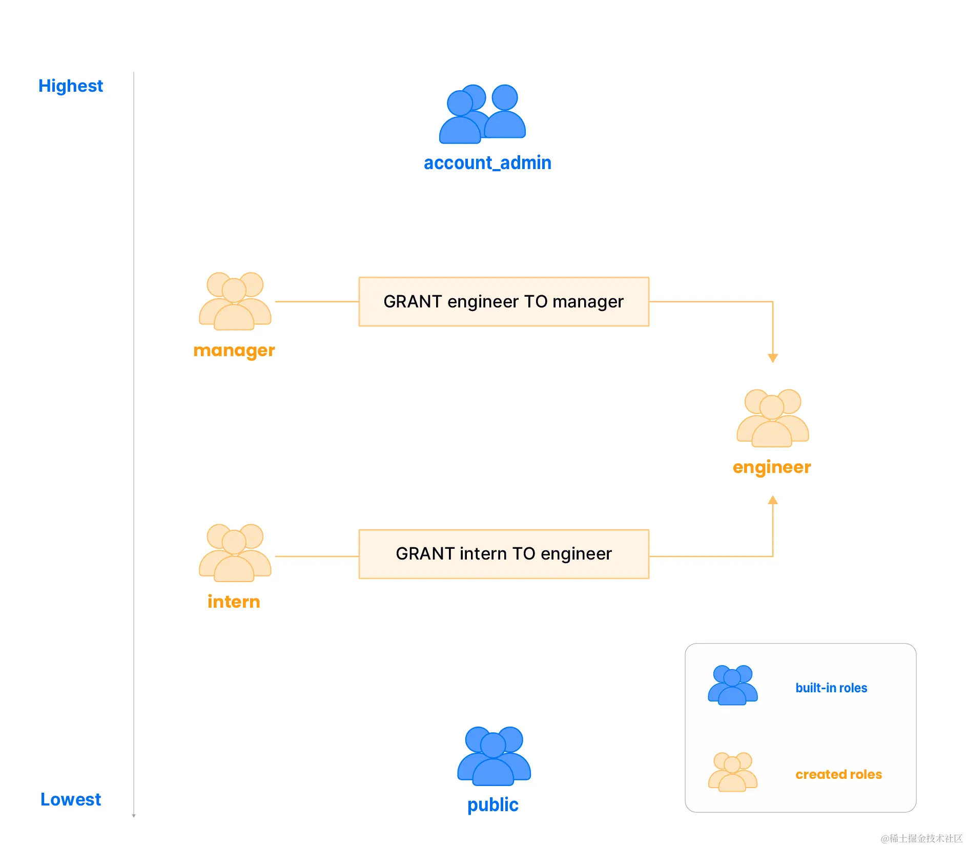 考虑一个场景,创建了三个角色:manager、engineer 和 intern。在这个例子中,intern 角色被授予给 engineer 角色。因此,engineer 不仅拥有他们自己的一套权限,还继承了与 intern 角色相关的权限。进一步扩展这个层级,如果 engineer 角色被授予给 manager,那么 manager 现在获得了 engineer 和 intern 角色的固有权限。