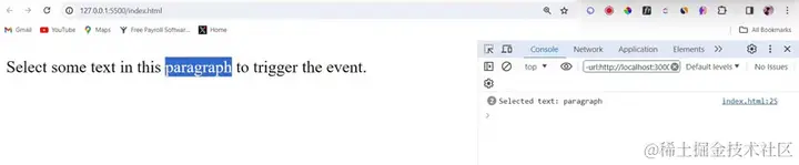 因此,当我尝试通过双击此文本来选择文本时,我们的自定义事件被触发,您可以在开发人员工具右侧看到日志。