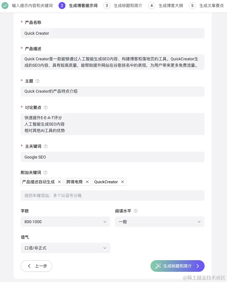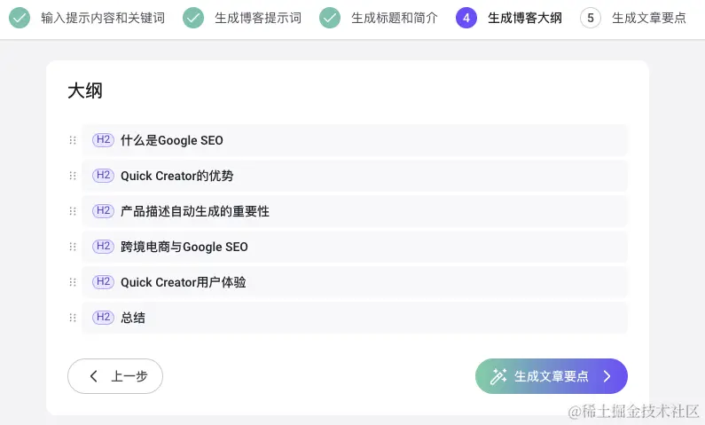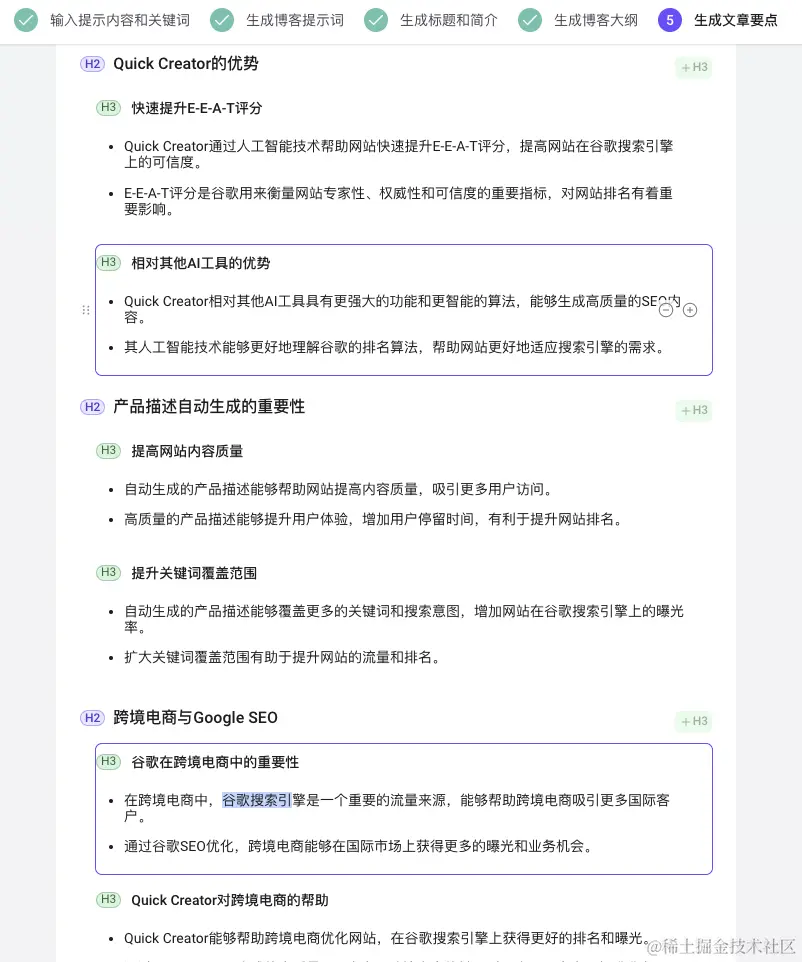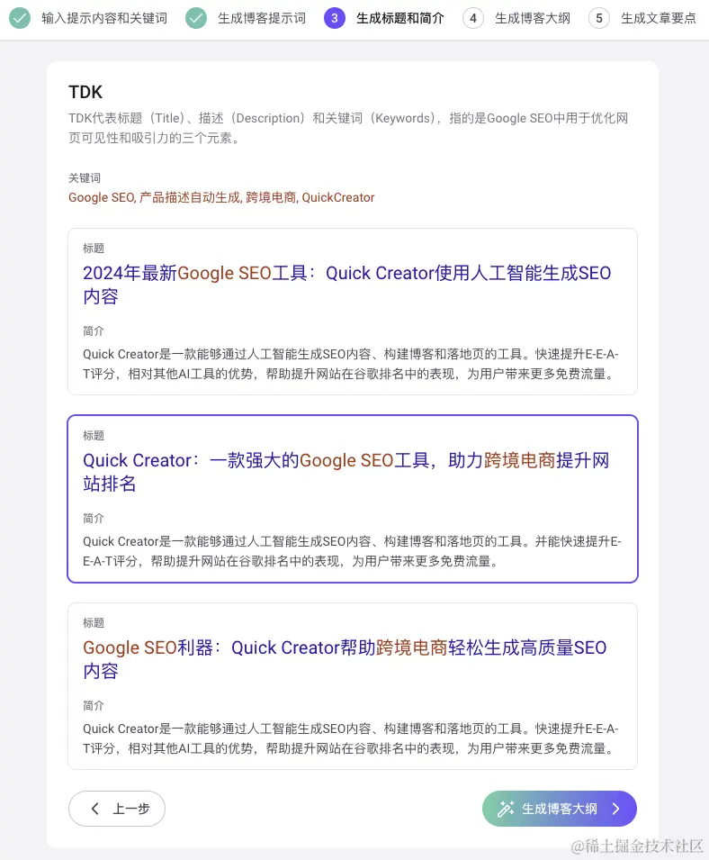 QuickCreator不仅能自动生成流畅自然的优质内容,还能让内容符合SEO的最佳规范(比如标题、关键词分布、元描述和Slug等)。这些都能让搜索引擎更愿意展示你的产品。
