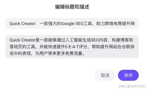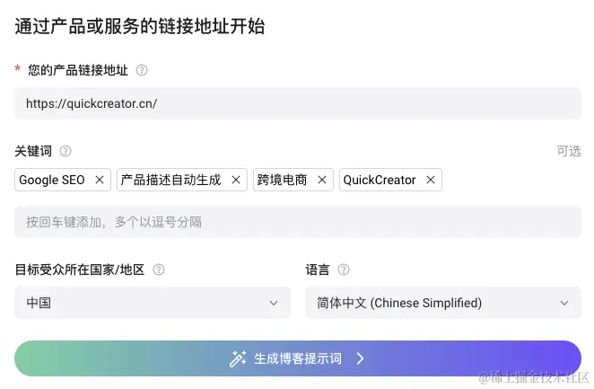 对于那些刚开始涉足跨境电商的朋友们来说,写出那种能吸引顾客眼球的产品描述可能真的是个挑战。但是你知道吗,一个好的产品描述不仅能让你的顾客更容易下单,还能帮你吸引到更多的免费流量呢! 这里介绍一个神器,QuickCreator。这个工具用了一些智能算法,能自动“吐”出高质量的产品描述。而且它还挺懂行,知道怎么根据最新的SEO趋势来调整内容,让我们的内容更容易被搜索引擎找到。 接下来,我就给大家简单介绍,怎么用QuickCreator来自动生成那些能提高销量的产品描述吧!