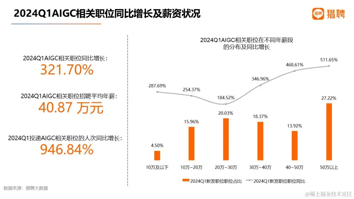 猎聘大数据研究院于4月8日发布《2024一季度就业大数据洞察报告》。猎聘大数据显示,2024年一季度,AIGC相关职位同比增长321.70%,呈现急剧增长态势。同时,投递该领域的人次水涨船高,同比增长946.84%。AIGC相关职位的招聘薪资也非常可观,一季度招聘平均年薪为40.87万。在不同的年薪段中,50万以上的职位占比最多,为27.22%;其次是20万-30万,占比20.03%。各个年薪段的AIGC相关职位都出现了较大幅度的增长,其中50万以上的职位增幅最多,为511.65%。由此可见,AIGC相关职位呈现出明显的高薪化特征。从AIGC相关职位的城市分布TOP10来看,北京、上海、深圳位列前三,占比为25.66%、19.21%、13.19%;杭州和广州排名第四和第五。