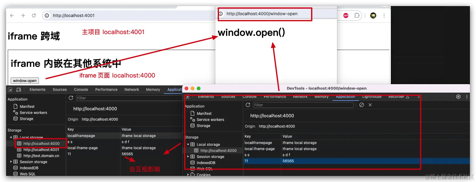 b. 实践中发现浏览器中一个页面内嵌入到iframe中(与主项目跨域,非localhost的形式访问),里面的window.open即便打开的是跟iframe内嵌页面是同域的也不会复制sessionStorage,localStorage也不共享。其原因是window.open打开的页面是否跨域不取决于内嵌页面,而在于主项目,主项目是否与window.open是同域