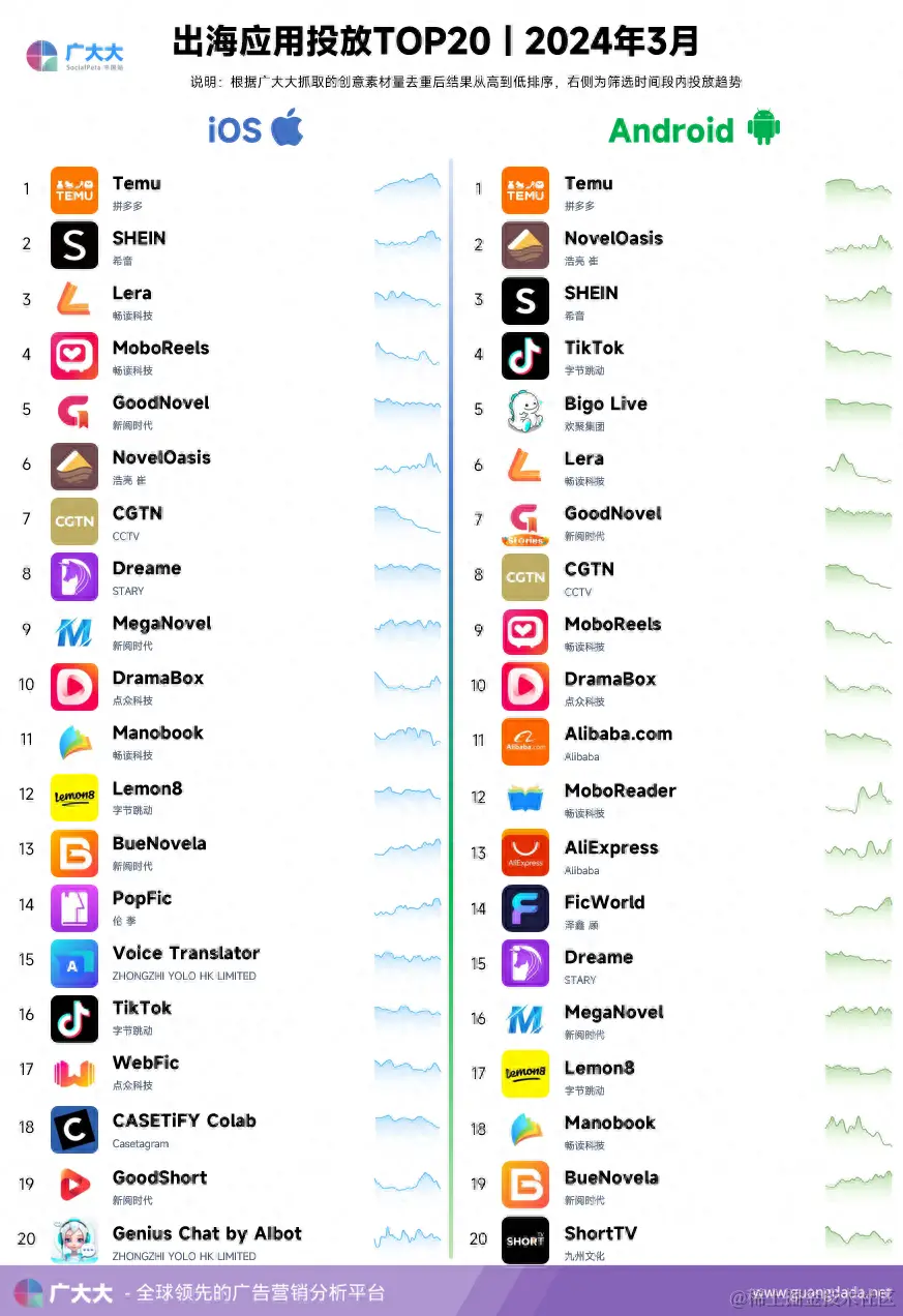 3月妇女节加持下,电商应用发力明显,【Temu】重回双端投放榜首;网文产品继续爆量,新阅时代【MegaNovel】开启冲榜模式,排名直升9名进入前10;YOLO旗下两款应用稳定上升,其中翻译应用【Voice Translator】来到榜单第15名。