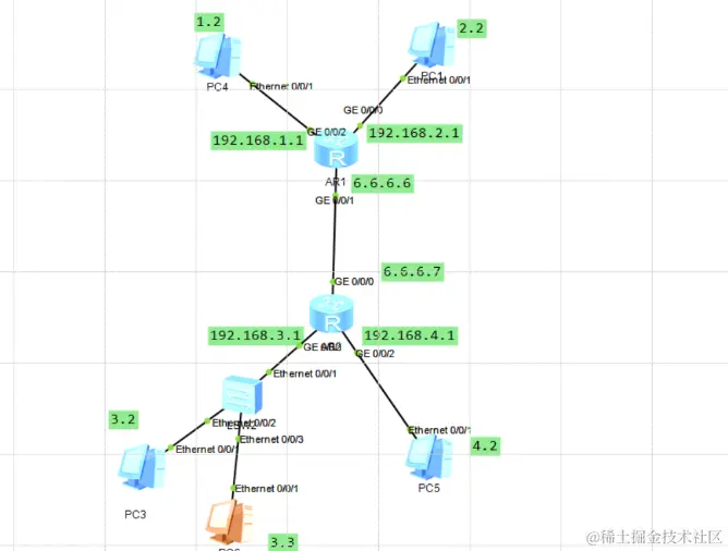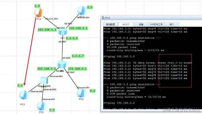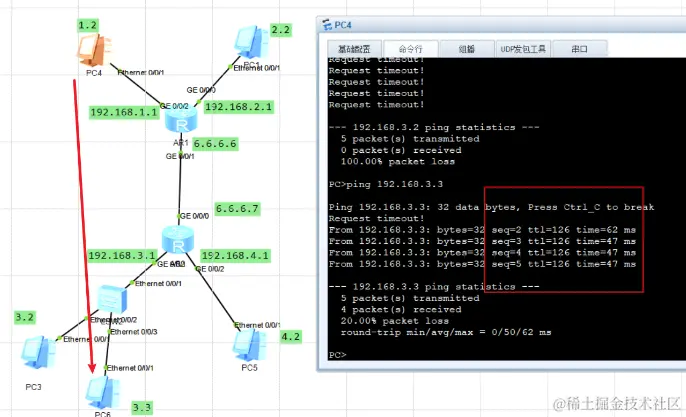 PC4(192.168.1.2) 访问 PC6(192.168.3.3)