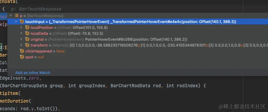 发现在点击有高度的柱状图时既然在点击事件内返回了坐标,以及点击对应的BarTouchedSpot,BarTouchedSpot这个对象内部有touchedBarGroupIndex,这个变量表示当前点击了第几个柱状图。一路查看源码,看在哪个地方对这个变量进行赋值的。如图三。判断当前点击区域属于哪条柱状图,底层逻辑是拿当前点击的位置坐标x,y,依次去判断是否属于最近的柱状图。在X坐标,点击区域需要大于柱状图的左侧X坐标,小于右侧X坐标。在Y坐标,需要判断点击区域的Y坐标大于柱状图底部Y坐标,小于柱状图上部Y坐标。我们的目标是希望点击底部title,能被识别为点击了对应的柱状图,看源码,有个变量touchExtraThreshold,在计算是否在柱状图内时,默认加了个变量的上下左右值,应该是对柱状图点击热区的一个预留值。