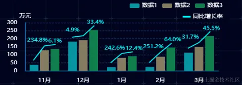 需在柱状图中展示每个月份的数据增长率,如下图效果: