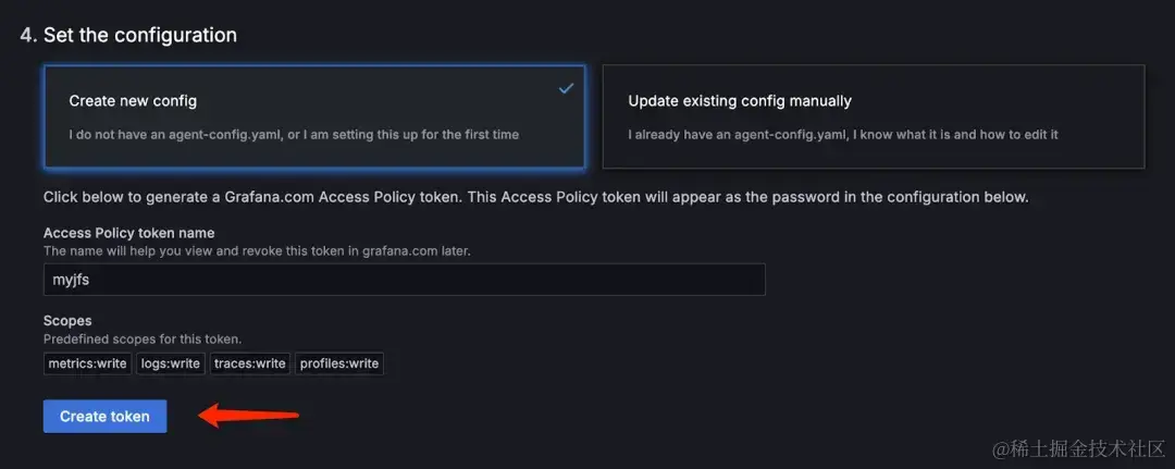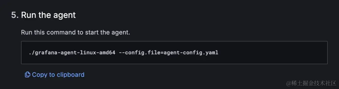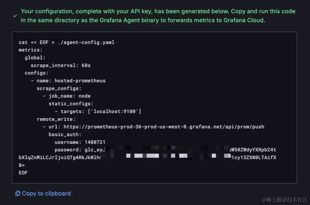这一步将为 grafana-agent 生成一个配置文件,如下图所示,这其实就是一个 Prometheus 的配置文件,但它将 Grafana Cloud 平台提供的服务地址以及相关的设置都配置好了。