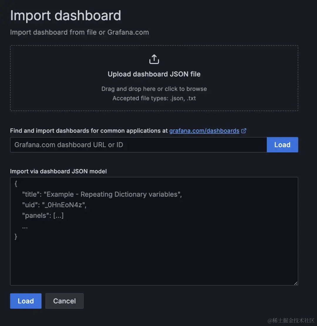 - 第二种,是导入一个预先创建好的的 Dashboard 模板,可以使用 json 格式的文件模板,也可以使用 Grafana 官方库提供的公共模板。