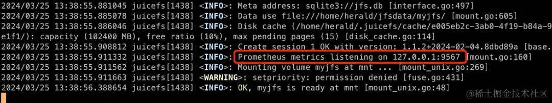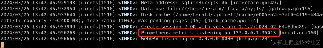 但是,在同一台主机上同时用不同的访问方式挂载文件系统,JuiceFS 就会随机分配一个端口给第二个访问方式。如下图,这个主机以经通过 mount 方式挂载了文件系统,同时又通过 WebDAV 方式进行挂载,这时就会分配一个随机的端口给 WebDAV 协议用做状态指标发布。