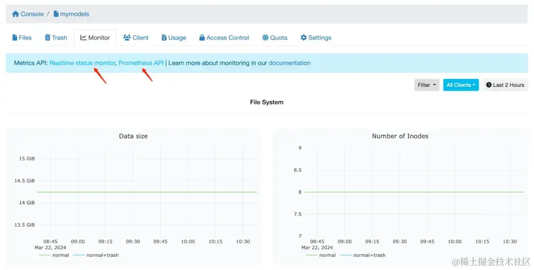 如上图,JuiceFS 云服务控制台可以查看文件系统最近 7 天的状态指标,箭头所指的超链接对应前述的两个状态发布地址,可以直接复制给 Prometheus 使用。