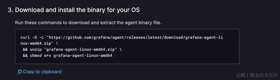 将这里的代码复制并粘贴到 JuiceFS 所在的本地主机运行,这段代码会将 grafana-agent 客户端下载到当前目录并赋予可执行权限。而这个 grafana-agent 程序本质上就是一个经过定制的 Prometheus 客户端。
