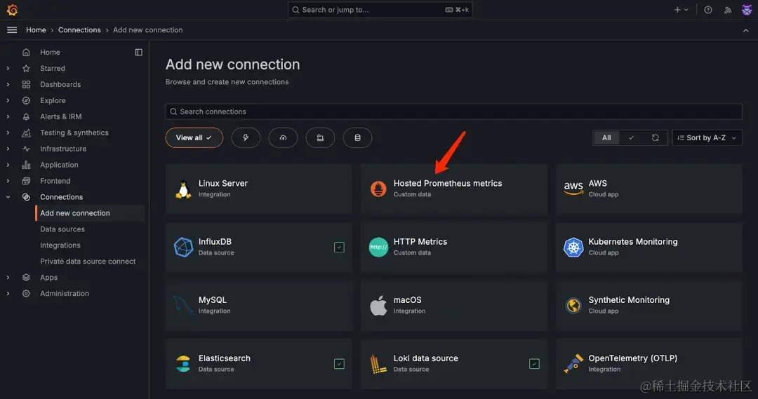 拥有了 Grafana Cloud 账号和 Stack,接下来就可以开始配置数据源了,如下图所示,Grafana Cloud 提供了一系列可以连接的数据源。