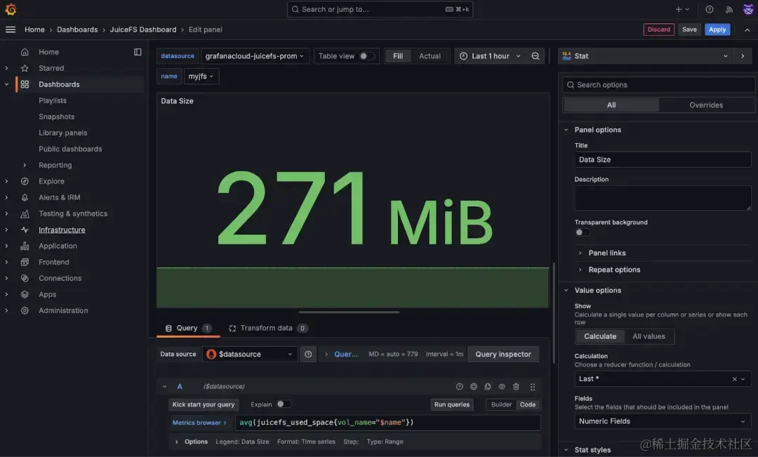 在下方的 Query 区域,选择 Data source,即收集了 JuiceFS 状态指标的 Prometheus 服务。然后在 Metrics browser 中选择要查询的指标。侧栏有一系列选项可以对显示的内容做细节微调,比如颜色,条件格式等。