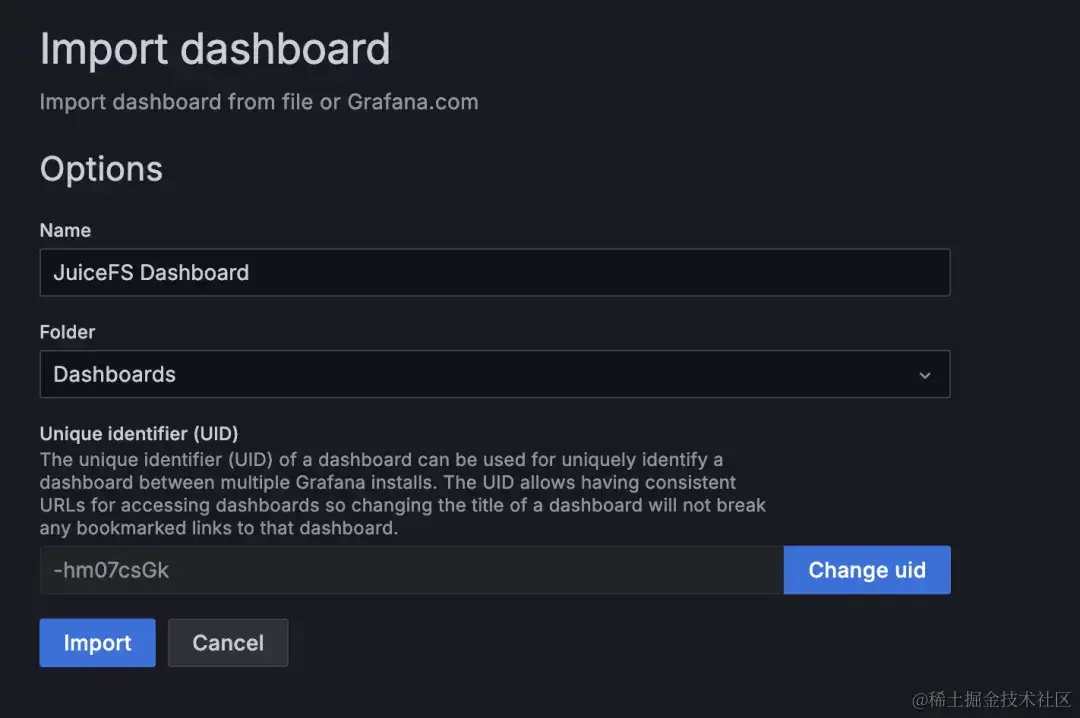 在导入模板时,可以自定义 Dashboard 的名称和存放的位置,通常保持默认即可。