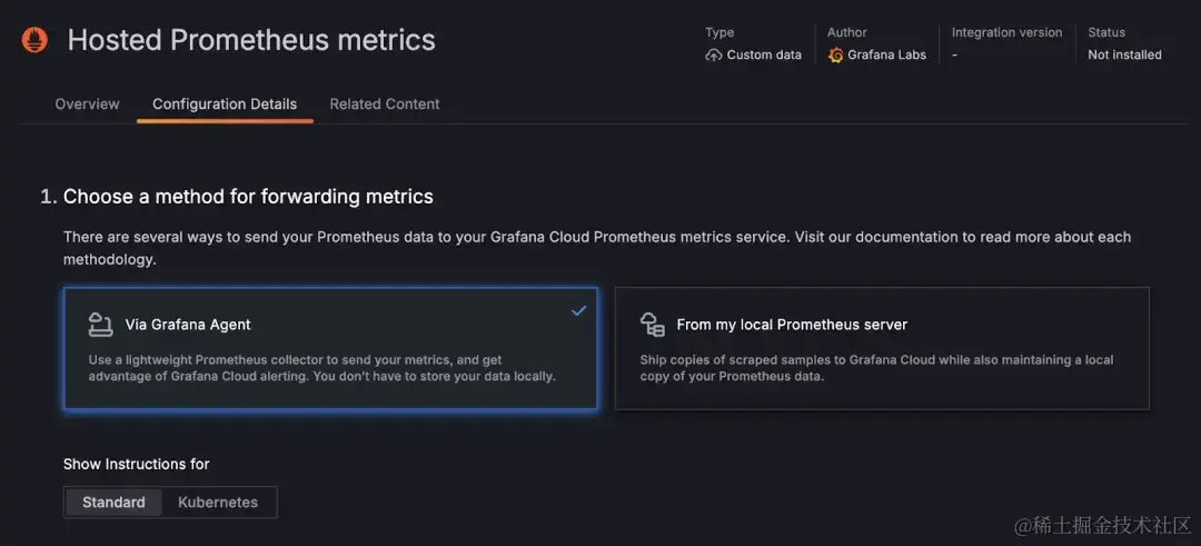 第一种的特点是指标数据完全保存在云端,本地没有数据副本,可以结合 Grafana Cloud 的警报服务一起使用。第二种则需要在本地自行部署和维护 Prometheus 实例,数据完全保存在本地,同时会拷贝一个副本到云端使用。