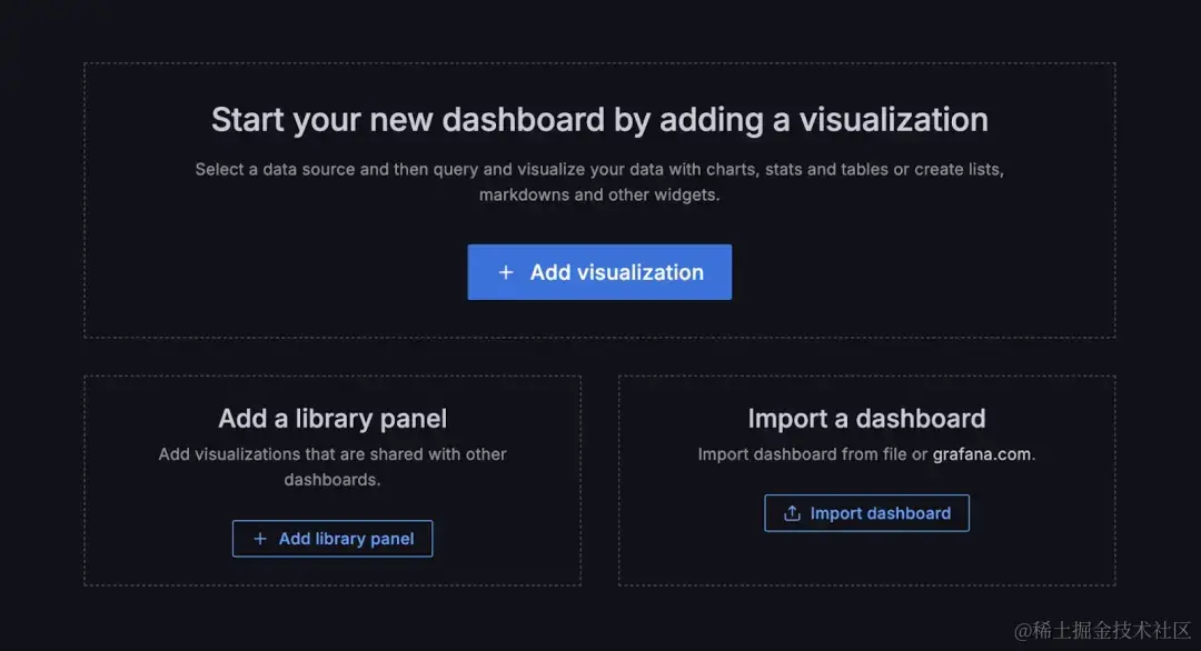 Dashboard 是由一系列 Panel 所组成的(Grafana 中也把 Panel 叫做 Visualization),添加一个 Visualization 就是添加一个 Panel。