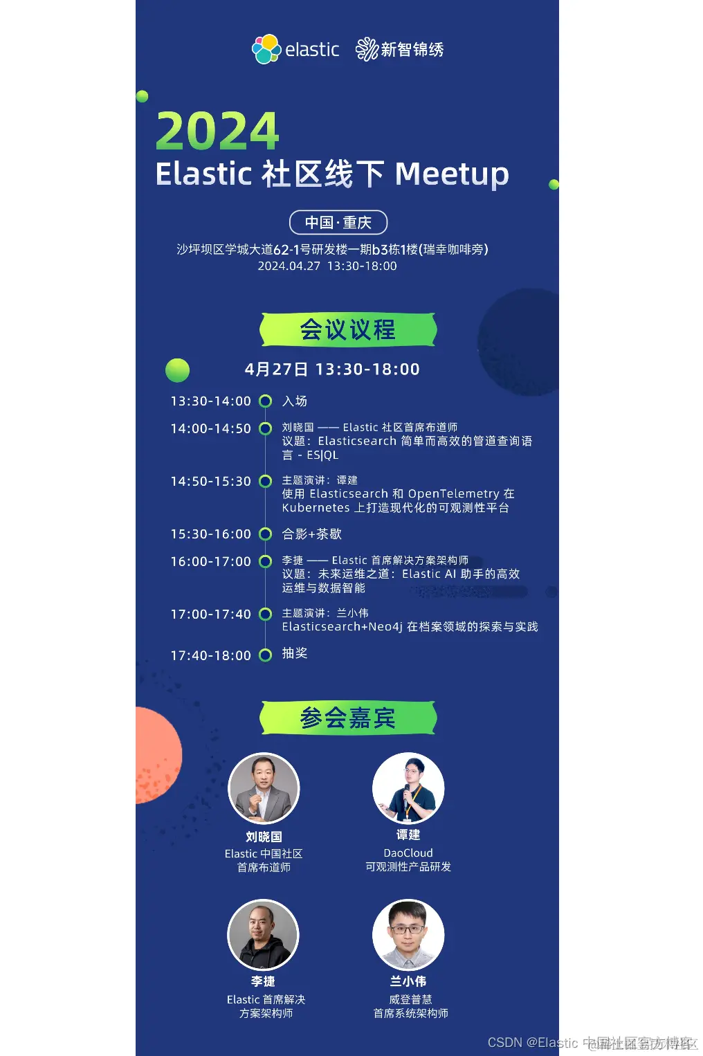 2024 Elastic Meetup 重庆站活动,由 Elastic、新智锦绣联合举办,现诚邀广大技术爱好者及开发者参加。