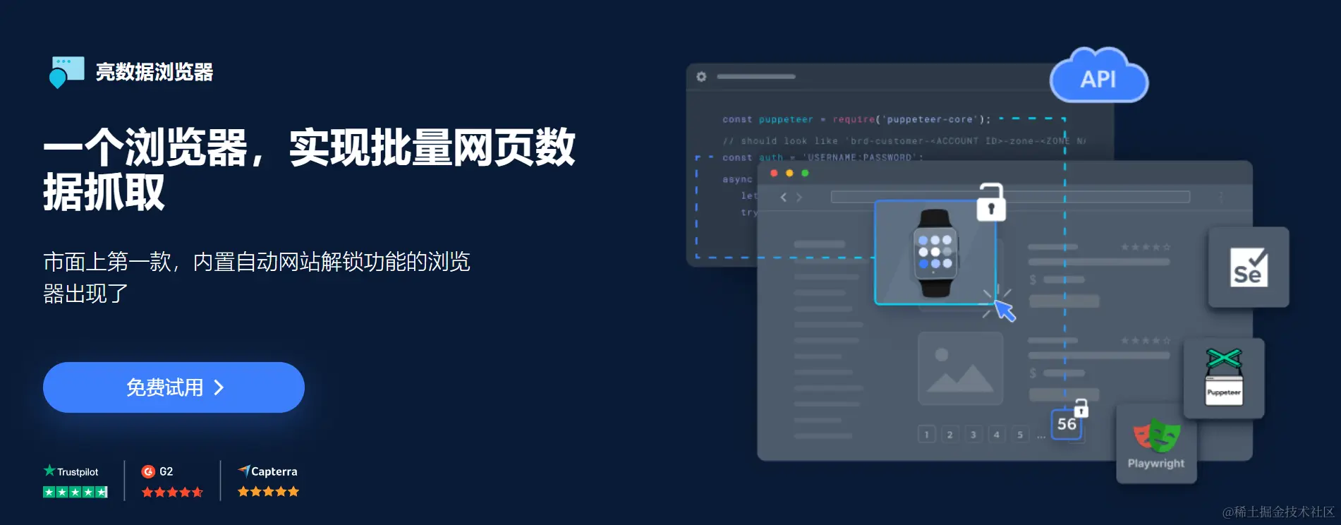 亮数据网络解锁器是一款具有内置网站解锁功能的有头浏览器,其可以自动管理所有网站深层解锁操作,包括:CAPTCHA解决、浏览器指纹识别、自动重试、标头选择、cookie和Javascript渲染等功能。亮数据浏览器无需扩展内部基础架构,非常适合大批量网页数据抓取项目。另外,亮数据浏览器通过使用 AI 技术,不断调整、自动学习绕过机器人检测系统,实现比代理更高的解锁成功率,告别屏蔽麻烦。
