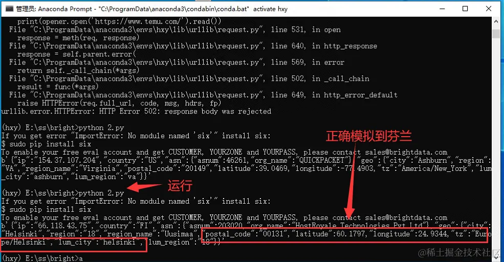 首先测试基础网站:lumtest.com/myip.json,复… test.py测试一下,输出类似以下内容,可以看到成功模拟到芬兰首都赫尔辛基,且为高质量住宅用户。