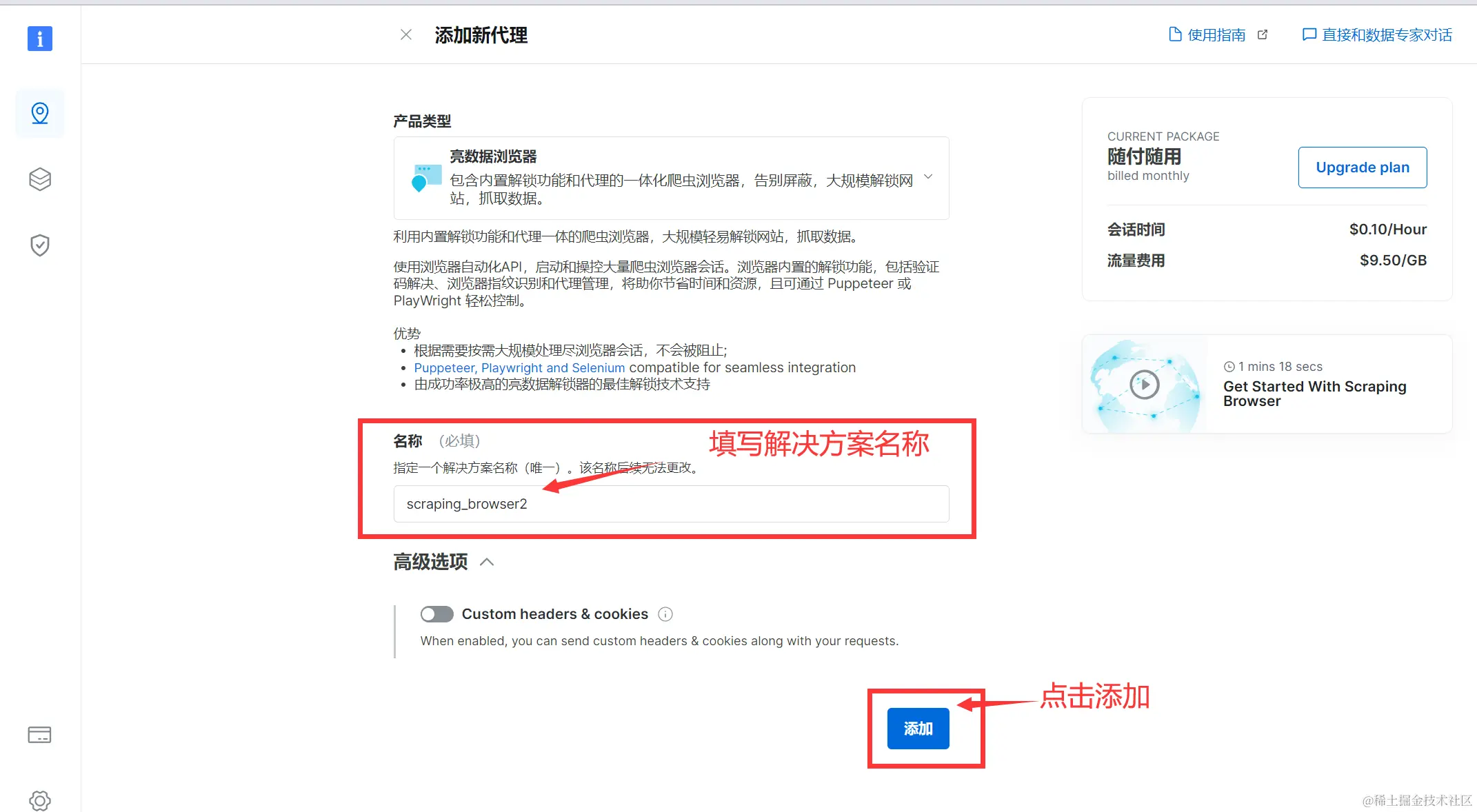 进入亮数据浏览器配置页面后,填写解决方案名称,然后添加到控制台中。