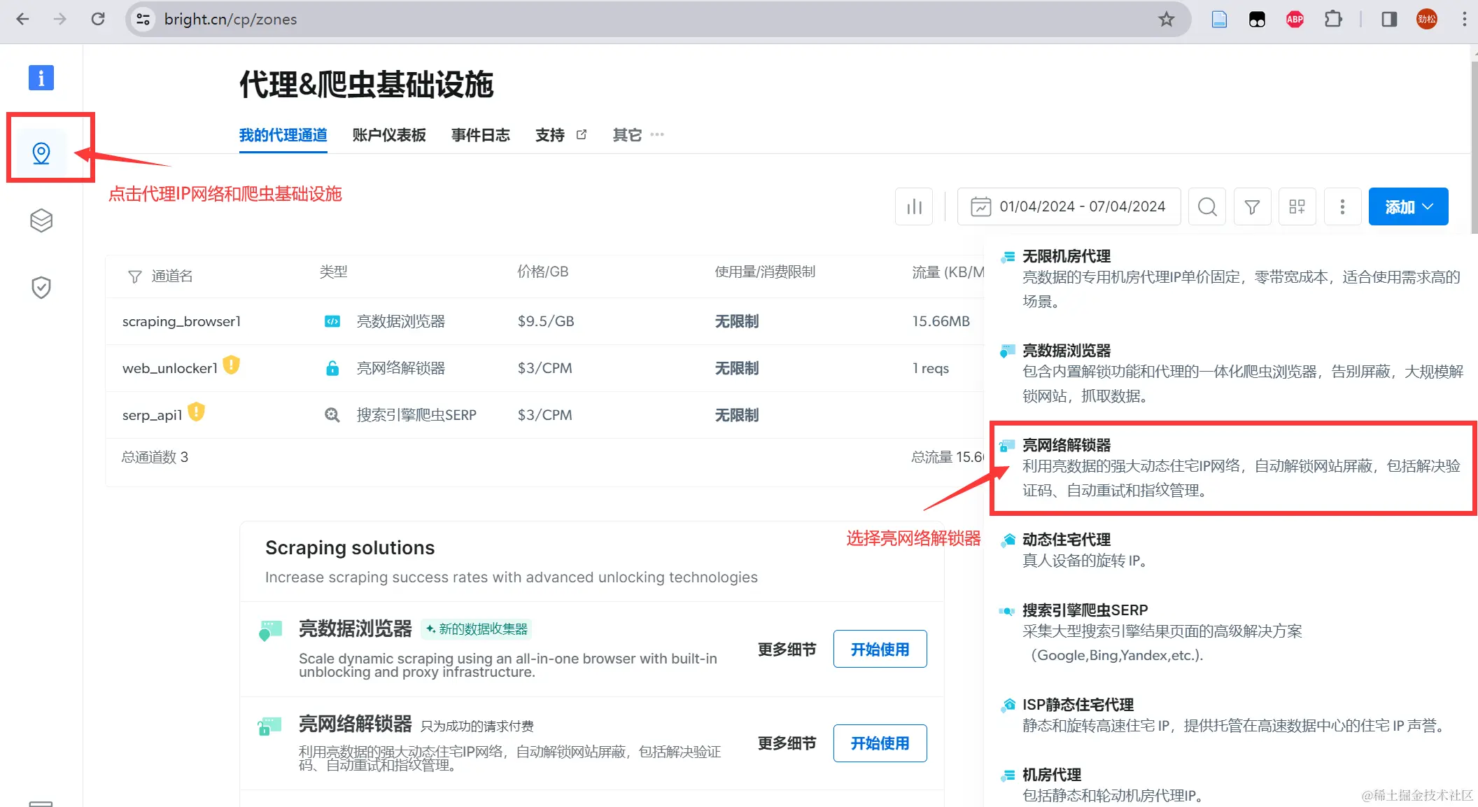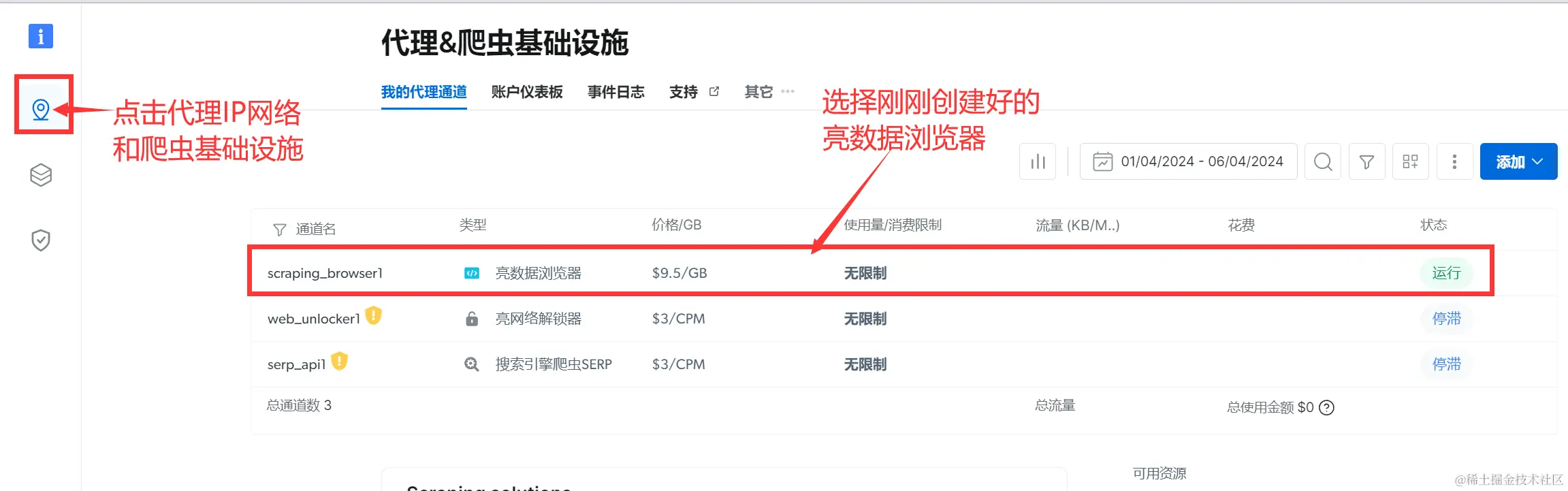 首先回到控制台,同样点击代理IP网络和爬虫基础设施,选择刚刚创建好的亮数据浏览器,点击进入详情。