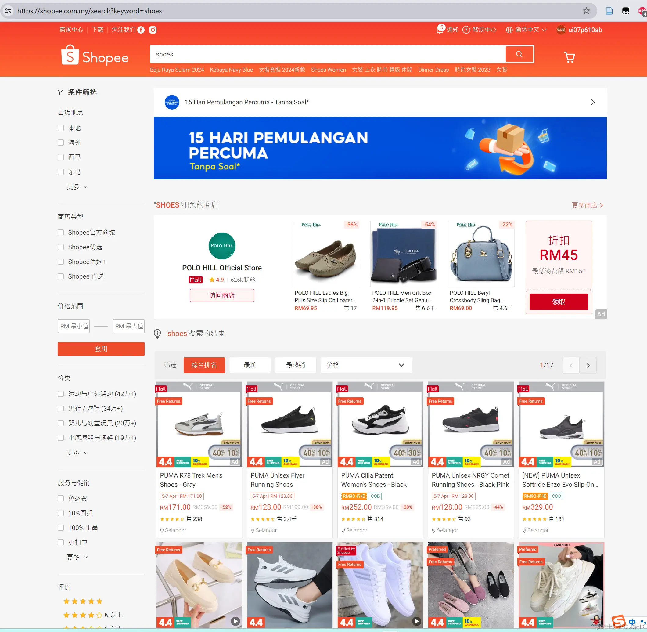 首先进入Shopee官网,在搜索框中输入shoes进行搜索,随着搜索结果的加载,页面展示出了与“shoes”相关的商品列表。这些商品以图片和文字的形式呈现,每张图片都展示了鞋子的外观,而文字则包含了鞋子的品牌、型号、价格等关键信息。