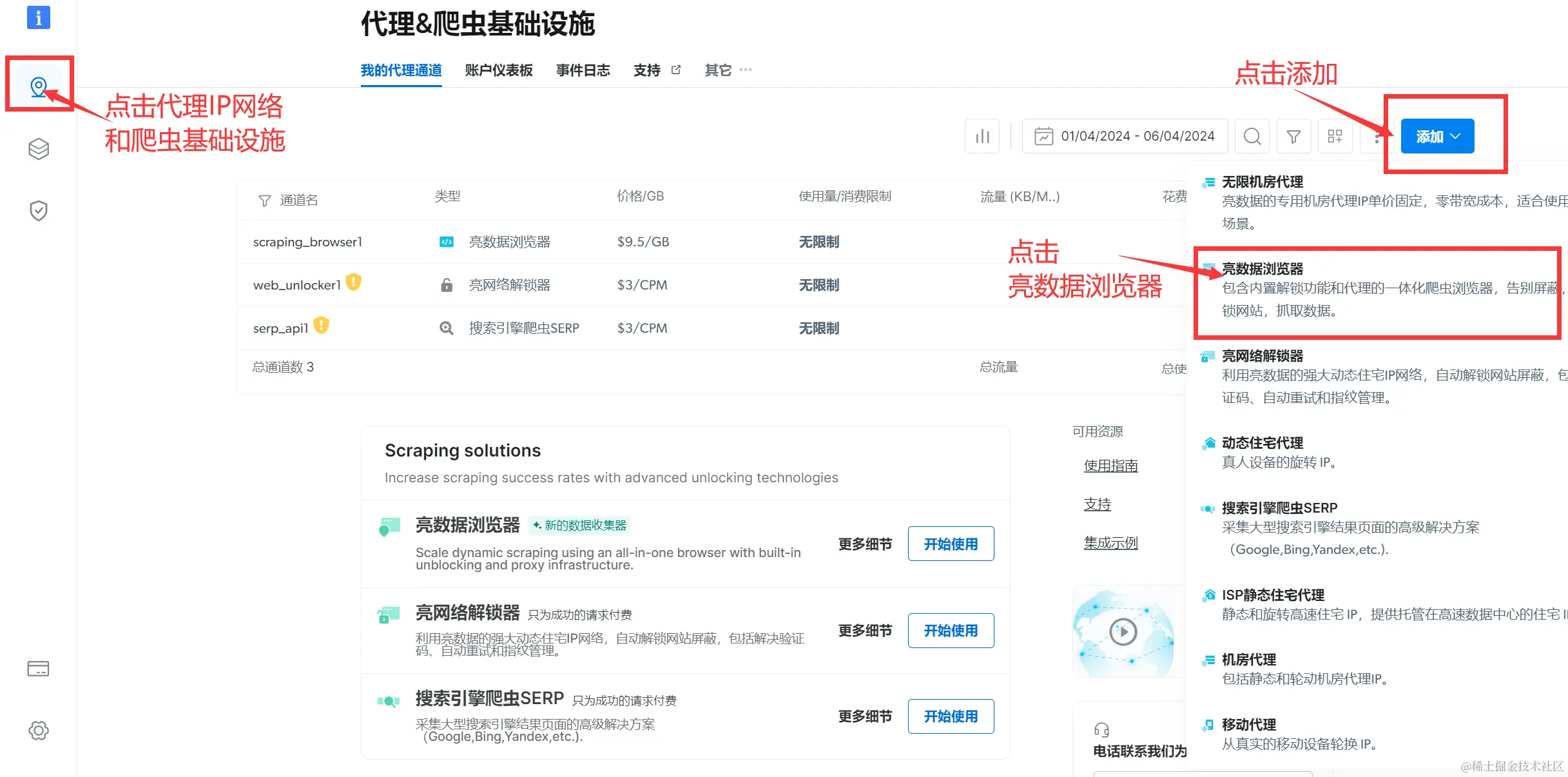 首先进入控制台页面,点击基础设施,然后点击添加,选择亮数据浏览器。