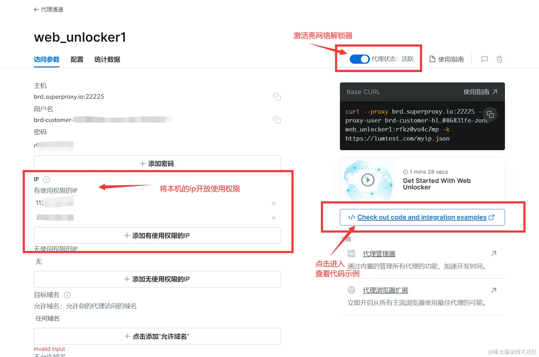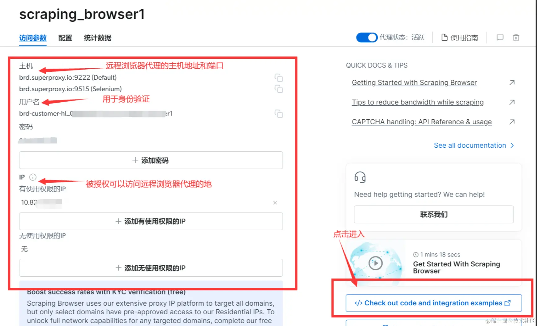 首先,观察左侧参数栏,主机参数是默认的远程浏览器代理的主机地址和端口。brd.superproxy.io 是服务器的地址,而9222和9515是这个服务监听的端口号。通过这个地址和端口,客户端可以与远程的浏览器实例进行通信。用户名和密码参数用于身份验证,在连接到远程浏览器代理时,用户名用以证明访问权限。IP 参数用于授权可以访问远程浏览器代理的地址。