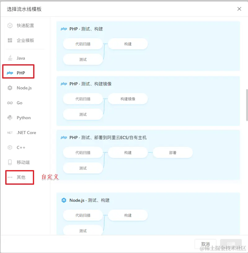 一般可以根据技术架构,选择不同的流水线模板,没有合适的就用自定义的即可。