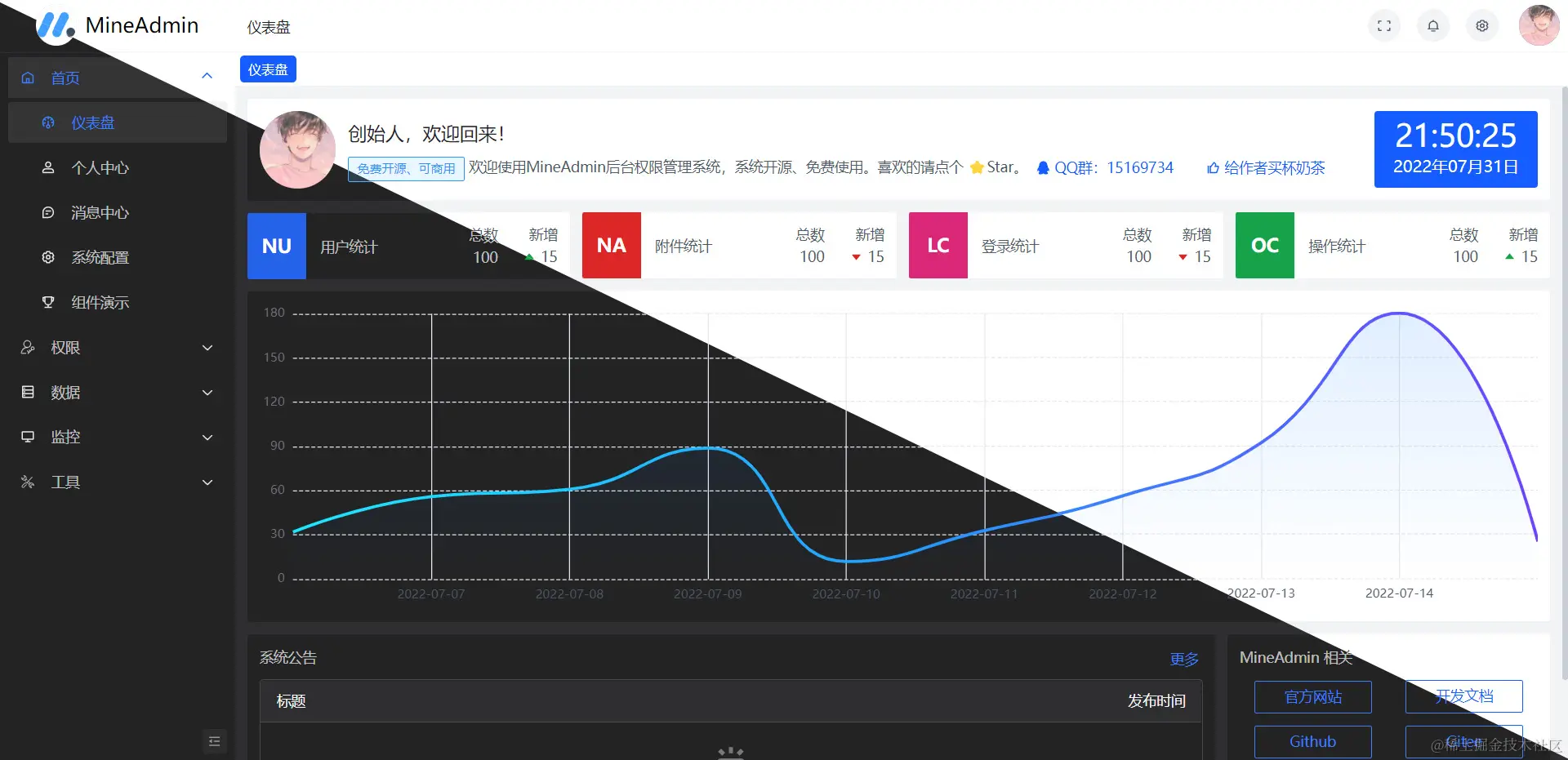 专门适配于MineAdmin后台权限管理系统的前端中后台模板,使用了vue3, vite3, pinia, arco design等主流开发技术。这款界面很Nice,V 哥认为比较奔放,设计大胆,看下图的撞色设计,你觉得是胡丽花骚还是霸气侧漏?