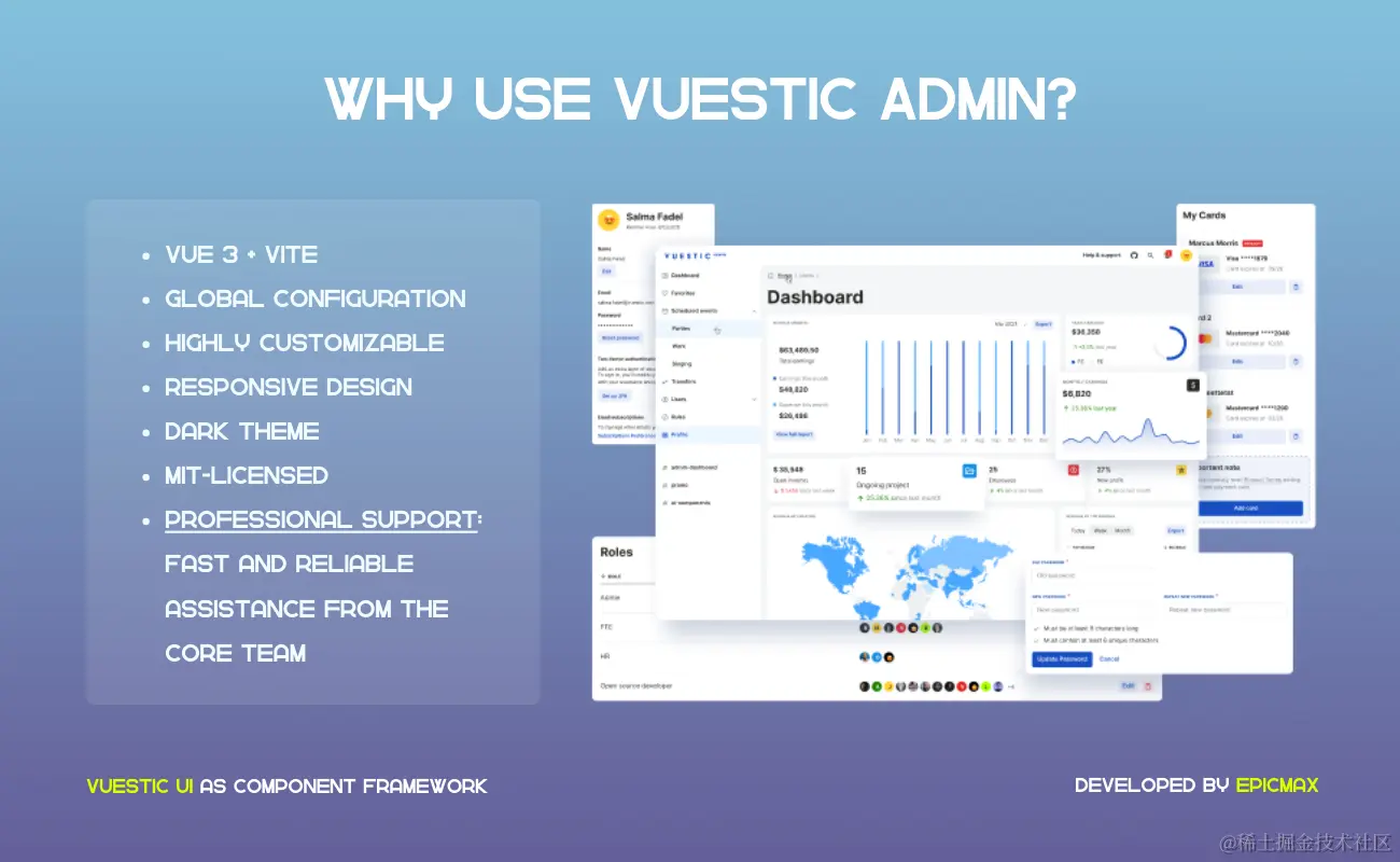 6. 开源:作为一个开源项目,Vuestic Admin 允许开发者自由地使用、修改和分发代码,这为社区驱动的开发和持续改进提供了可能。